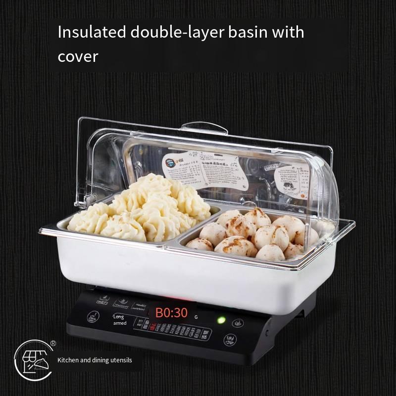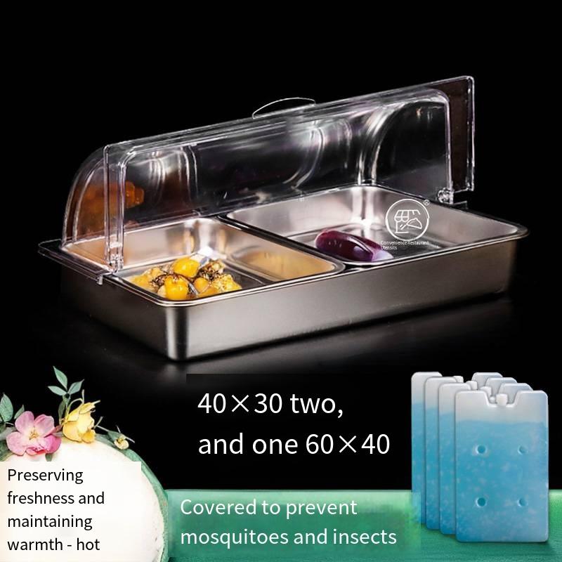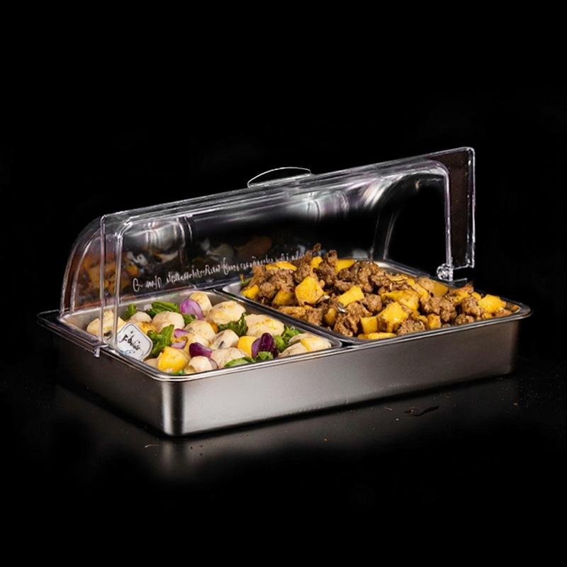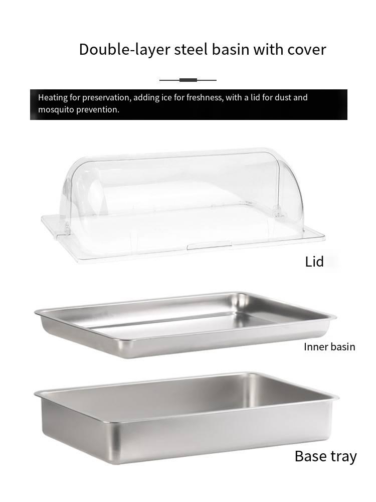 201 stainless steel basin, large bottom basin with inner basin, space between basins for ice to keep food fresh, hot water to stay warm, comes with transparent PC dust cover, highly transparent, shatterproof and heat-resistant.